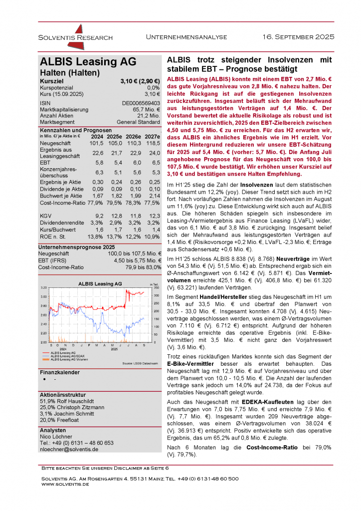 - ALBIS Leasing AG - ALBIS trotz steigender Insolvenzen mit stabilem EBT – Prognose bestätigt; Kursziel: 3,10 €; Votum: Halten - 16.09.2025