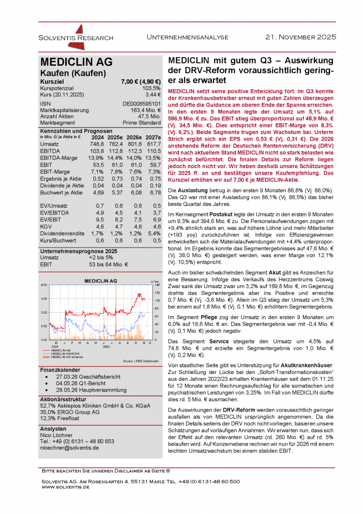 - MEDICLIN AG - MEDICLIN mit gutem Q3 – Auswirkung der DRV-Reform voraussichtlich geringer als erwartet; Kursziel: 7,00 €, Votum: Kaufen - 21.11.2025
