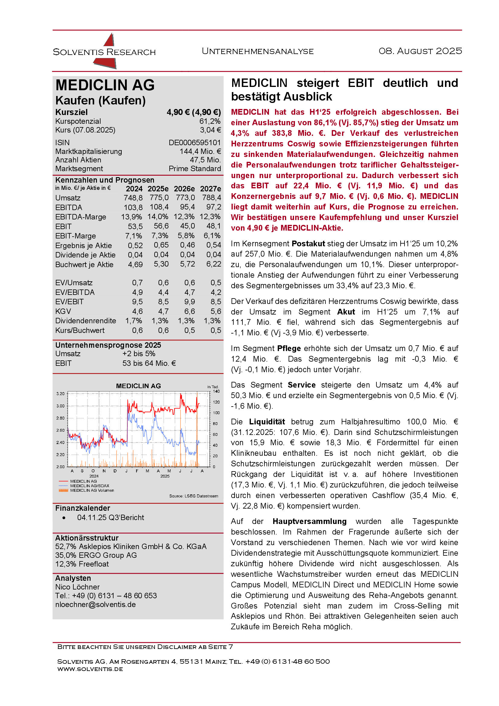 - MEDICLIN AG - MEDICLIN steigert EBIT deutlich und bestätigt Ausblick; Kursziel: 4,90 €, Votum: Kaufen - 08.08.2025