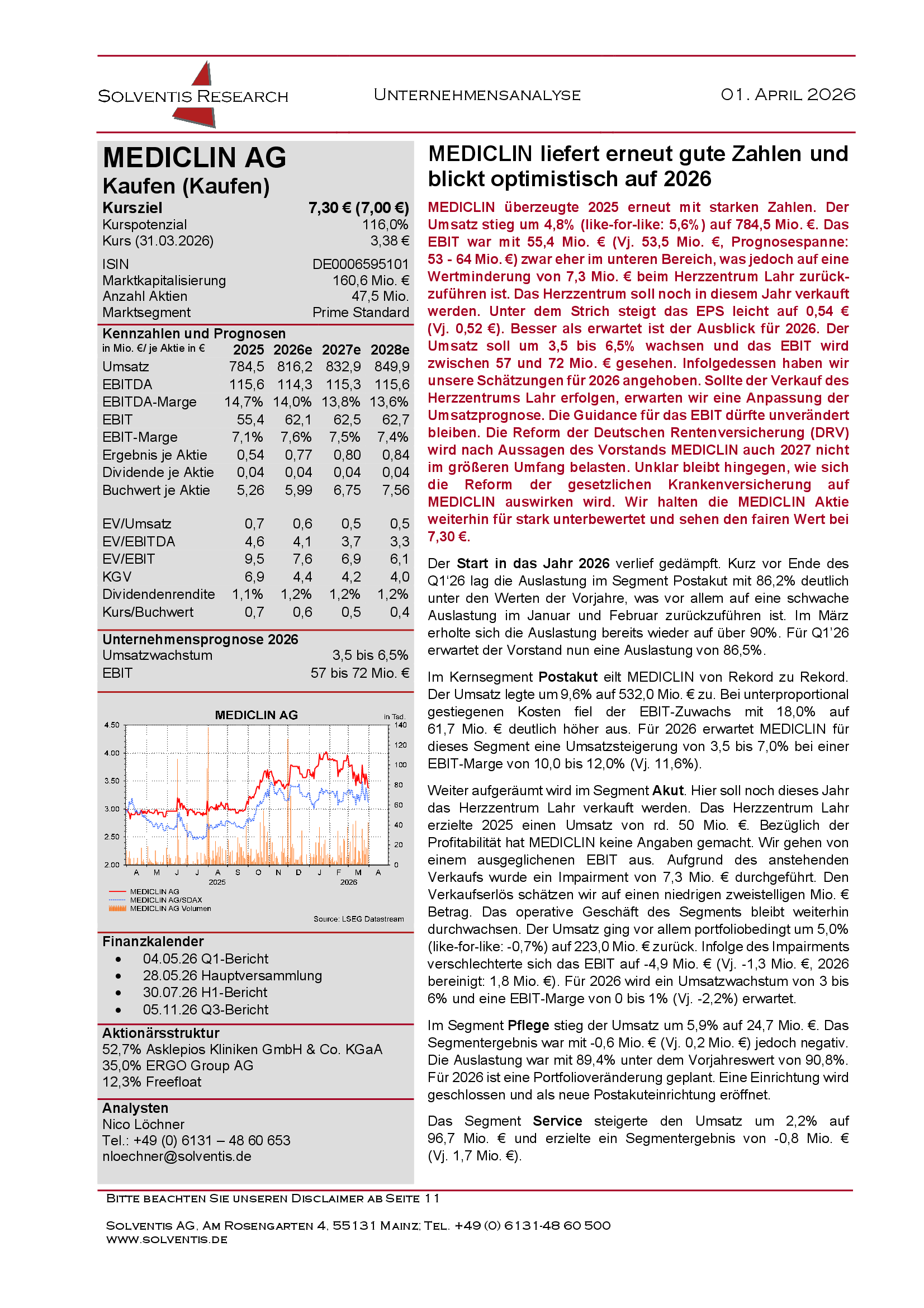 - MEDICLIN AG - MEDICLIN liefert erneut gute Zahlen und blickt optimistisch auf 2026; Kursziel: 7,30 €, Votum: Kaufen - 01.04.2026