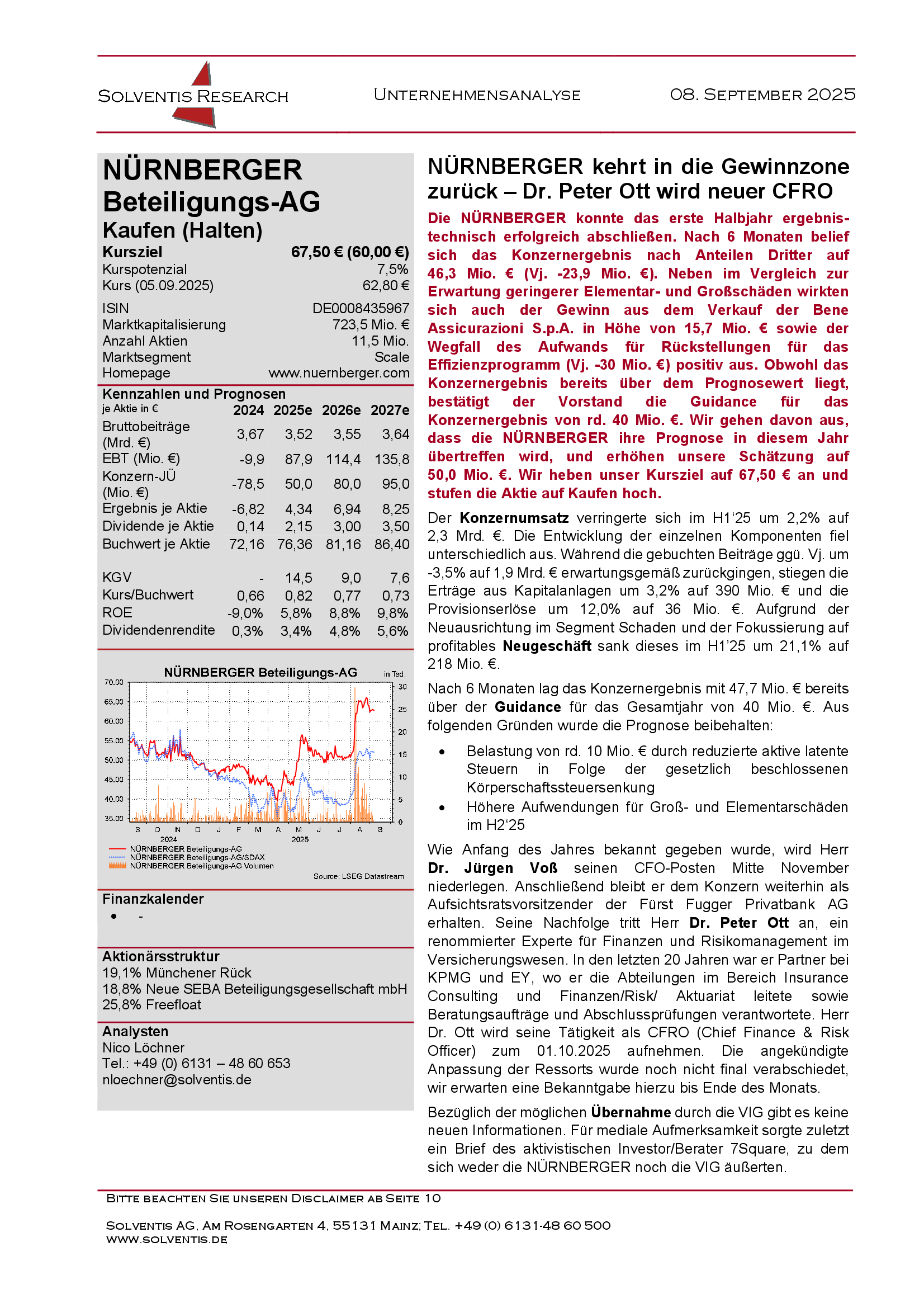 - NÜRNBERGER Beteiligungs-AG - NÜRNBERGER kehrt in die Gewinnzone zurück – Dr. Peter Ott wird neuer CFRO; Kursziel: 67,50 €, Votum: Kaufen - 08.09.2025