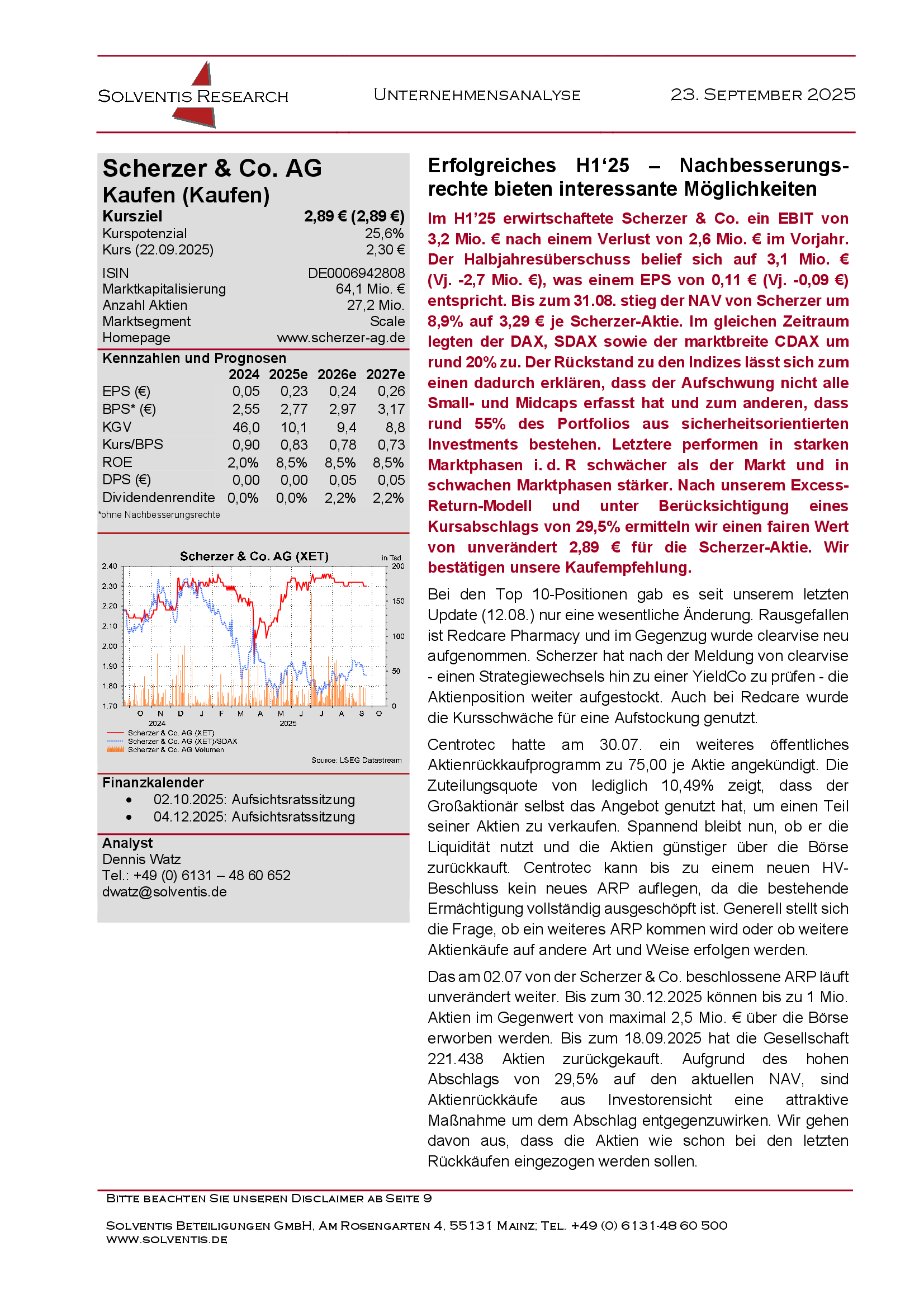 - Scherzer & Co. AG - Erfolgreiches H1‘25 – Nachbesserungsrechte bieten interessante Möglichkeiten; Kursziel: 2,89 €; Votum: Kaufen - 23.09.2025