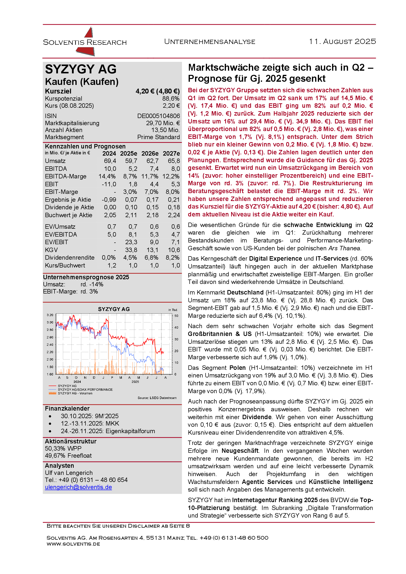 - SYZYGY AG - Marktschwäche zeigte sich auch in Q2 – Prognose für Gj. 2025 gesenkt; Kursziel: 4,20 €; Votum: Kaufen - 11.08.2025